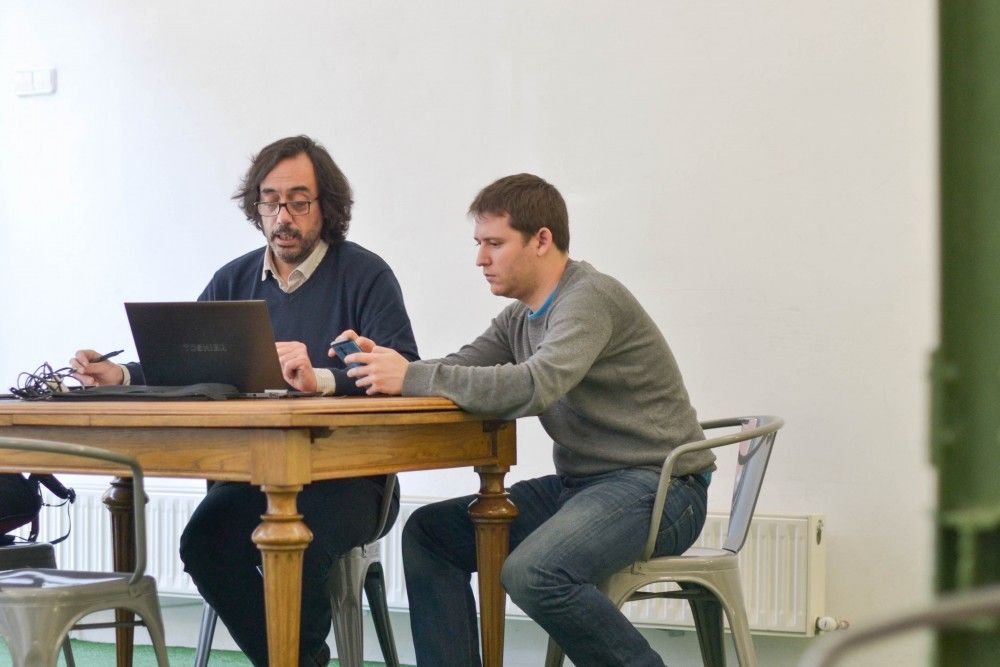 • Siete miembros de la Startup tecnológica Tu Parroquia se reúne en una de las zonas disponibles para emprendedores y freelance en el espacio de coworking Freeland en Madridtrabajando en Freeland